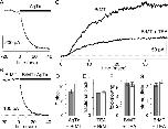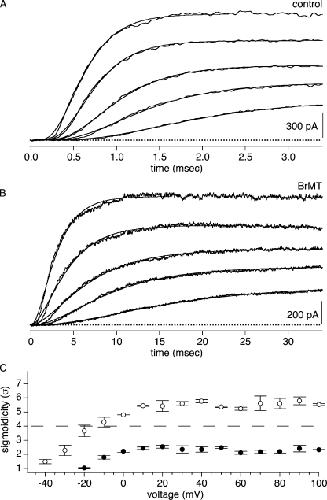 Figure 2. IK activation waveforms from ShBΔ patches were fit with Eq. 1. (A) Fits of Eq. 1 to ShBΔ activation at 0, 20, 40, 70, and 100 mV. (B) Fits of Eq. 1 to activation in 5 μM BrMT. Same voltages as A. (C) Sigmoidicity from fits of Eq. 1 to IK activation. Hollow circles, control condition; filled circles, 5 μM BrMT, n = 4 patches. |