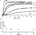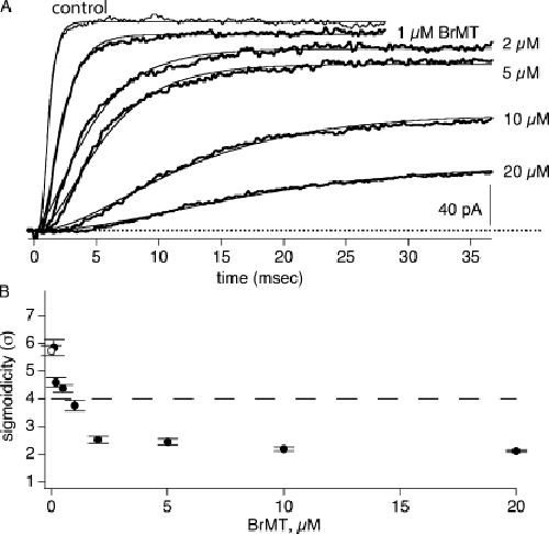 Figure 3. Sigmoidicity of activation approaches a value of 2 as BrMT concentration is increased. (A) ShBΔ IK during voltage steps to +40 mV under control condition (thin trace) or 1, 2, 5, 10, and 20 μM BrMT (thick traces). Experimental IK is average of multiple sweeps. Smooth lines are Eq. 1 fit to IK. (B) Sigmoidicity from fits of Eq. 1 to activation at +40 mV, n = 3–5 patches. |