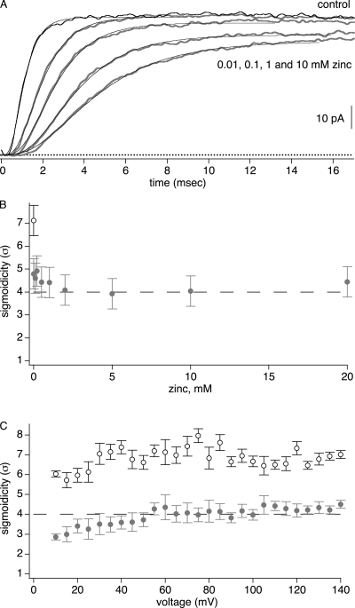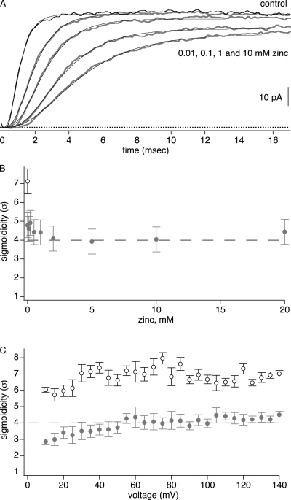 Figure 4. Divalent zinc reduces ShBΔ sigmoidicity to σ = 4. These experiments used the pH 6.8 external solutions described in Materials and Methods. (A) ShBΔ IK activated at +60 mV in 0, 0.01, 0.1, 1, and 10 mM zinc. Smooth thin lines are fits of Eq. 1 to data. (B) Sigmoidicity under control condition (hollow circle) or with added zinc (gray circles), n = 5–8 patches. (C) Sigmoidicity of IK is constant over a wide voltage range. In 2 mM zinc, sigmoidicity is ∼4 (gray circles), n = 5 patches. Control sigmoidicity is >4 (hollow circles), n = 3 patches. |