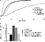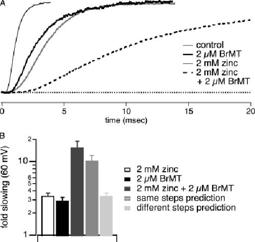 Figure 5. BrMT and zinc slow the same activation steps, yet induce different sigmoidicities. The pH 6.8 solutions described in Materials and Methods were used for experiments in this figure. (A) IK at +60 mV during application of BrMT and/or zinc. Traces are scaled to match peak IK. (B) Slowing induced by zinc and/or BrMT was determined from τ in fits of Eq. 1, n = 4. The light gray bar is the multiplicative product of the fold-slowing in 2 mM zinc and 2 μM BrMT. This predicts the degree of slowing expected from both ligands together if they both slow the same activation step. The speckled bar is the degree of slowing expected if BrMT and zinc slow different activation steps: the combined slowing would be no more than the slowest of the two alone, in this case, zinc. |