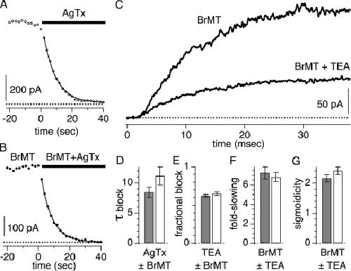 Figure 6. BrMT does not compete with ligands that block the external pore of ShBΔ channels. All data were measured during 50-ms pulses to +40 mV given every 2 s. Blockers were applied by manually triggering solution switching during the interval between pulses. Solution exchange requires <1 s. (A) Circles are peak ShBΔ IK, measured by averaging over several milliseconds after a steady-state level of IK activation. At time = 0, 50 nM agitoxin-2 is added to the external solution. (B) Same as A, but with 5 μM BrMT in all solutions. (C) Block of ShBΔ IK by 1 mM TEA in the presence of 5 μM BrMT. (D) Mean time constant of block by 50 nM agitoxin-2 with 5 μM BrMT (gray bar, n = 6 patches), and without BrMT (white bar, n = 5 patches). (E) Mean block by 1 mM TEA with 5 μM BrMT (gray bar, n = 6 patches), and without BrMT (white bar, n = 9 patches). (F) Mean fold-slowing of activation by 5 μM BrMT with 1 mM TEA (gray bar) and without TEA (white bar). ShBΔ IK was fit by Eq. 1, and the fold-slowing is the ratio of τ in BrMT to τ before addition of BrMT. (G) Gray bar is sigmoidicity of ShBΔ IK in 5 μM BrMT with 1 mM TEA (gray bar) and without TEA (white bar). |
