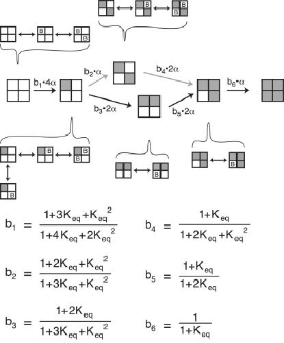 Figure 7. Schematic depicting the relevant states in an activation path involving one activating transition per subunit. In this model, BrMT simultaneously binds two of the four subunits to slow activation. The forward transition is set by the effect of the BrMT's slowing factor, bx, on the activation rate constant α. The slowing coefficient of each transition (b1–b6) is determined from the probability that BrMT is bound to individual resting subunits. Keq is the binding equilibrium for BrMT. |