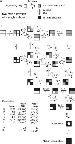 Figure 8. Model of negative cooperative inhibition of ShBΔ activation. (A) Depiction of activation in a single subunit. Each subunit completes two activation steps. Forward transitions toward the open state are marked by a darkening of the subunit from white to gray in the first step and then gray to black in the second step. The first forward transition is set by the effect of the BrMT's slowing factor, b, on rate constant α, the reverse by β. The second forward transition has rate γ, and the reverse δ. In model BrMT, the reverse transition, β, is accelerated by a factor 1/b. (B) A model for implementing negatively cooperative binding of BrMT, such that it slows an early step in the Shaker activation pathway. The model is an elaboration of the ShBΔ activation model of Zagotta et al. (1994a). White subunits are available to bind BrMT. Vertical transitions are not affected by BrMT. The open state is demarcated with a hollow circle. The bottom-most is the “flickery” closed state. Equations for the BrMT slowing factors (b1–b6) are shown in Fig. 7. In model BrMT, all reverse transitions (those involving β) are accelerated by the inverse of the factor that slows the forward transition. This model does not attempt to account for the reduction of peak IK by BrMT. |