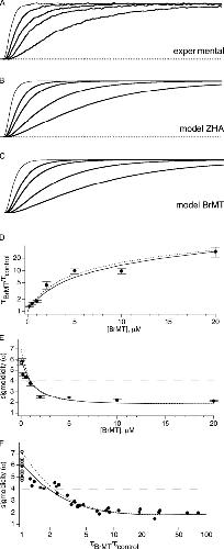 Figure 9. Effects of BrMT on simulated and experimental IK from ShakerBΔ. The negatively cooperative models used for simulations are depicted in Fig. 8 B. (A) ShBΔ IK from an outside-out patch upon activation to +40 mV. Thin line, control condition (no BrMT); thick lines, 1, 2, 5, and 10 μM BrMT. IK was normalized to match peak current level. (B) Simulated ShBΔ currents from model ZHA. Thin line, control condition; thick lines, 1, 2, 5, and 10 μM BrMT. (C) Simulated ShBΔ currents from model BrMT. Thin line, control condition; thick lines, 1, 2, 5, and 10 μM BrMT. (D) Filled circles, fold slowing of ShBΔ activation at +40 mV by BrMT, n = 4–9 patches; dotted line, model ZHA; solid line, model BrMT. (E) Filled circles, sigmoidicity of ShBΔ IK at +40 mV, n = 3–5 patches; hollow circle is control condition; dotted line, model ZHA; solid line, model BrMT. (F) Sigmoidicity of IK vs. slowing by BrMT. Each data point is a measurement in control solution (hollow circles), or a solution containing 0.5–20 μM of BrMT (filled circles). Dotted line, model ZHA; solid line, model BrMT. |