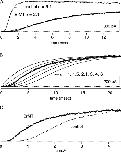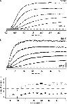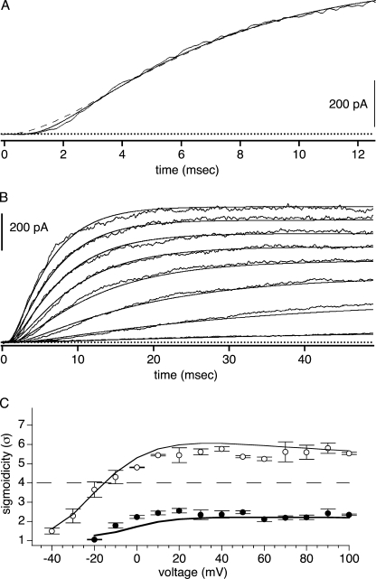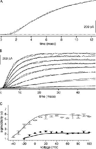 Figure 10. Voltage dependence of cooperative binding model BrMT. (A) Noisy line, experimental IK at +40 mV in 5 μM BrMT; smooth line, activation of model BrMT at +40 mV in 5 μM BrMT; dashed line, best fit of Eq. 1 to experimental IK. (B) Noisy lines, experimental IK in 5 μM BrMT at −20, −10, 0, 10, 20, 30, 40, and 50 mV; smooth lines, activation of model BrMT under identical conditions, using a reversal potential of −58.2 mV. (C) Lines are sigmoidicity of fits to IK from model BrMT. Circles are sigmoidicity from fits of Eq. 1 to experimental IK. Hollow circles, control condition; filled circles, 5 μM BrMT. |