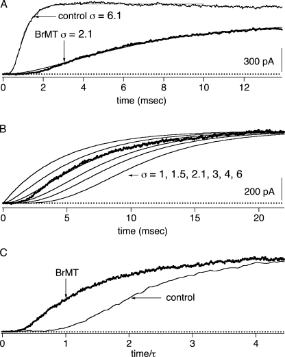 Figure 1. Sigmoidicity of ShakerBΔ activation is reduced by BrMT. (A) Activation of ShBΔ channels at +40 mV in an outside-out patch in the absence (control condition, thin trace) or presence (thick trace) of 5 μM BrMT. Overlaid on the data are fits of Eq. 1 with the indicated σ values. (B) BrMT IK and the fit of Eq. 1 (same as A) are replotted, and σ from the fit equation was altered to the indicated values. (C) Traces from A scaled in time to such that the time constant of IK rise from Eq. 1 is the same for both traces. After this scaling procedure, the delay before IK rise is shorter in BrMT than control. |