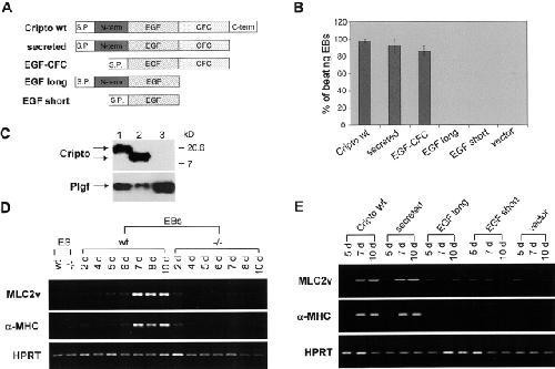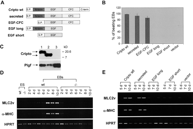 Figure 2. Functional dissection of Cripto. (A) Schematic representation of cripto cDNA derivatives. S.P., signal peptide. (B) Determination of minimal domains required for Cripto activity in cardiomyocyte differentiation. Either wt or deleted cripto mutant derivatives were transfected into Cripto−/− ES cells; empty vector was used as control. The percentage of EBs with rhythmically contracting areas detectable by light microscopy was scored on day 8 to 12. Data are representative of at least two independent experiments. (C) Western blot analysis of conditioned media from 293EBNA cells transfected with cripto cDNA deletion derivatives. Cells were cotransfected with Plgf expression vector as an internal control (see Materials and methods). Lane 1, EGF-CFC; lane 2, EGF long; lane 3, vector. The molecular mass of protein standards is indicated (kD). (D) Expression of cardiac-specific genes MLC2v and αMHC during in vitro differentiation of either wt or Cripto−/− ES cells. RT-PCR was performed on RNA extracted from either undifferentiated ES cells or EBs throughout a differentiation period of 10 d (days 2–10). HPRT gene expression was analyzed as an internal control. (E) RNA expression levels of MLC2v and cardiac αMHC genes during in vitro differentiation of Cripto−/− ES cells overexpressing either wt or cripto deletion mutants. RNA was harvested at days 5, 7, and 10 of the differentiation protocol and subjected to RT-PCR. Empty vector was used as a negative control. HPRT gene expression was analyzed as an internal control. The results are representative of two independent differentiation programs.