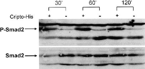 Figure 6. Activation of Smad2 in Cripto−/− cell aggregates treated with recombinant Cripto protein. 2-d-old Cripto−/− EBs were serum starved for 3 h and then treated with 10 μg/ml of recombinant Cripto protein for 30', 60', or 120' or left untreated, as indicated. Smad2 activation was detected by Western blot analysis using anti–phospho-Smad2 antibody. Levels of total Smad2 were also compared.