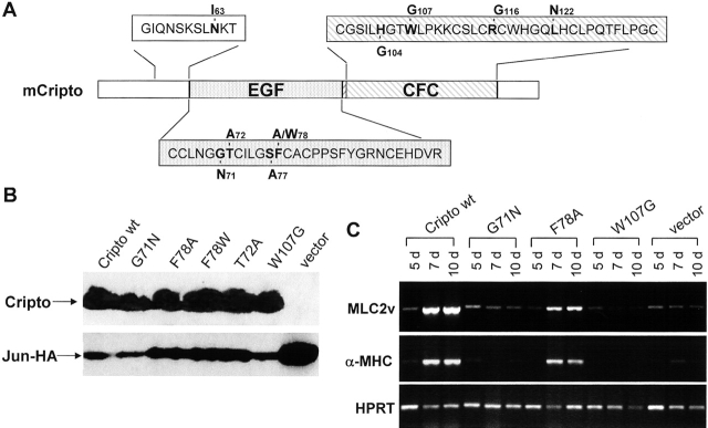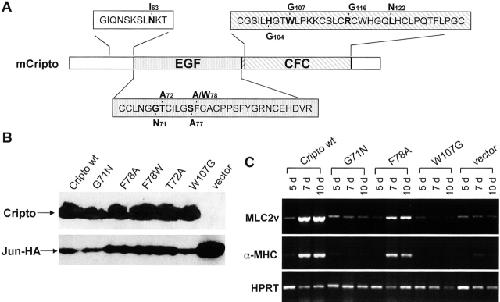 Figure 8. Identification of Cripto key residues required for cardiac induction and differentiation. (A) Schematic representation of wt and mutant Cripto derivatives. (B) Western blot analysis of total lysates from 293EBNA cells transfected with either wt or mutant cripto derivatives. Jun-HA expression vector was cotransfected as an internal control. Either polyclonal anti-Cripto or monoclonal anti-HA antibodies were used to detect protein levels. (C) RNA expression levels of the cardiac αMHC and MLC2v genes during in vitro differentiation of Cripto−/− ES cells (days 5, 7, and 10) overexpressing either wt or mutant cripto derivatives. Expression level of HPRT gene was analyzed as an internal control.