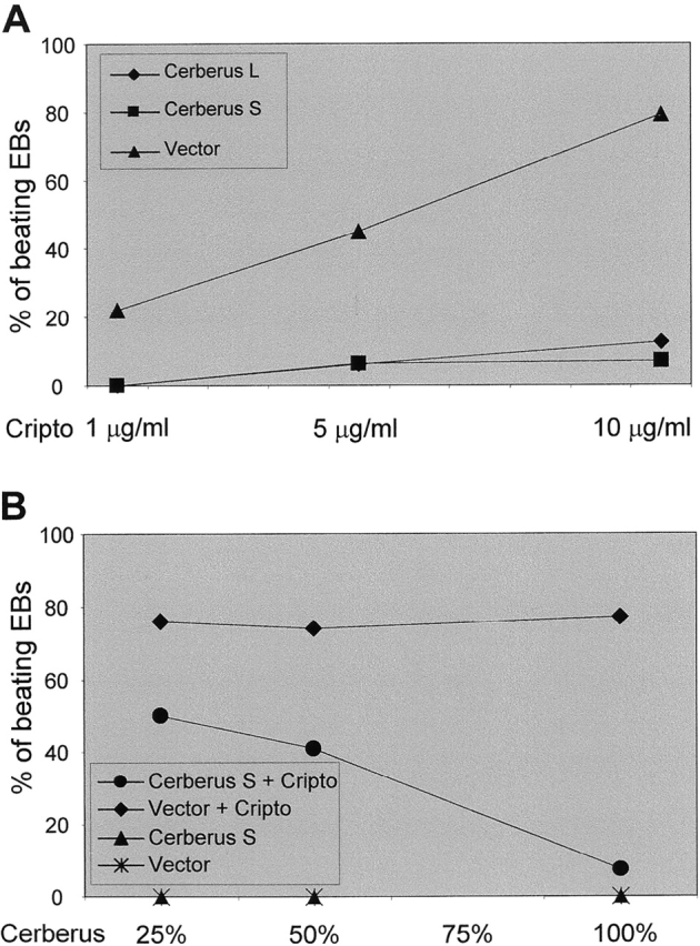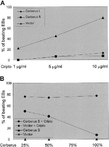 Figure 10. Exposure to Cerberus inhibits Cripto activity in cardiomyocyte differentiation assay. (A) Cerberus inhibits Cripto-dependent cardiomyocyte differentiation of Cripto−/− EBs. 2-d-old Cripto−/− EBs were cultured for 24 h in the presence of 100% (vol/vol) of media supernatant from 293T cells transiently expressing either Cerberus, Cerberus-S, or empty vector as control, in the presence of increasing amounts of recombinant Cripto protein. The number of Cripto−/− EBs containing beating areas was scored from day 8 to 12 of in vitro differentiation. Data are representative of two independent experiments. (B) Inhibition of Cripto by Cerberus-S is dose dependent. 2-d-old Cripto−/− EBs were cultured for 24 h with 10 μg/ml of soluble Cripto protein in the presence of increasing amounts (vol/vol) of media from 293T cells transiently expressing Cerberus-S. Cells were examined for cardiac differentiation as described above. Data are representative of two independent experiments.