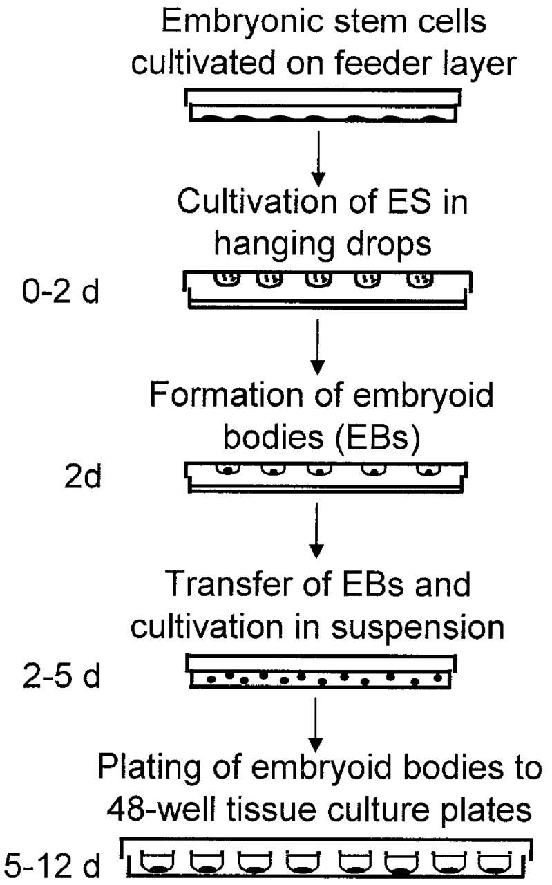 Figure 1. Schematic representation of the experimental protocol used for ES cell differentiation into cardiomyocytes (adapted from Maltsev et al., 1993).