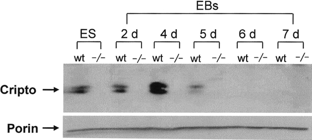 Figure 3. Cripto expression profile during the in vitro differentiation of ES cells. Total lysates of either undifferentiated ES cells or EBs at different days of differentiation (2–7 d), derived from either RI (wt) or DE7 (Cripto−/−) ES cells, were collected in lysis buffer and analyzed by Western blot using a polyclonal anti-Cripto antiserum (Minchiotti et al., 2000). Data were normalized to the expression level of Porin.