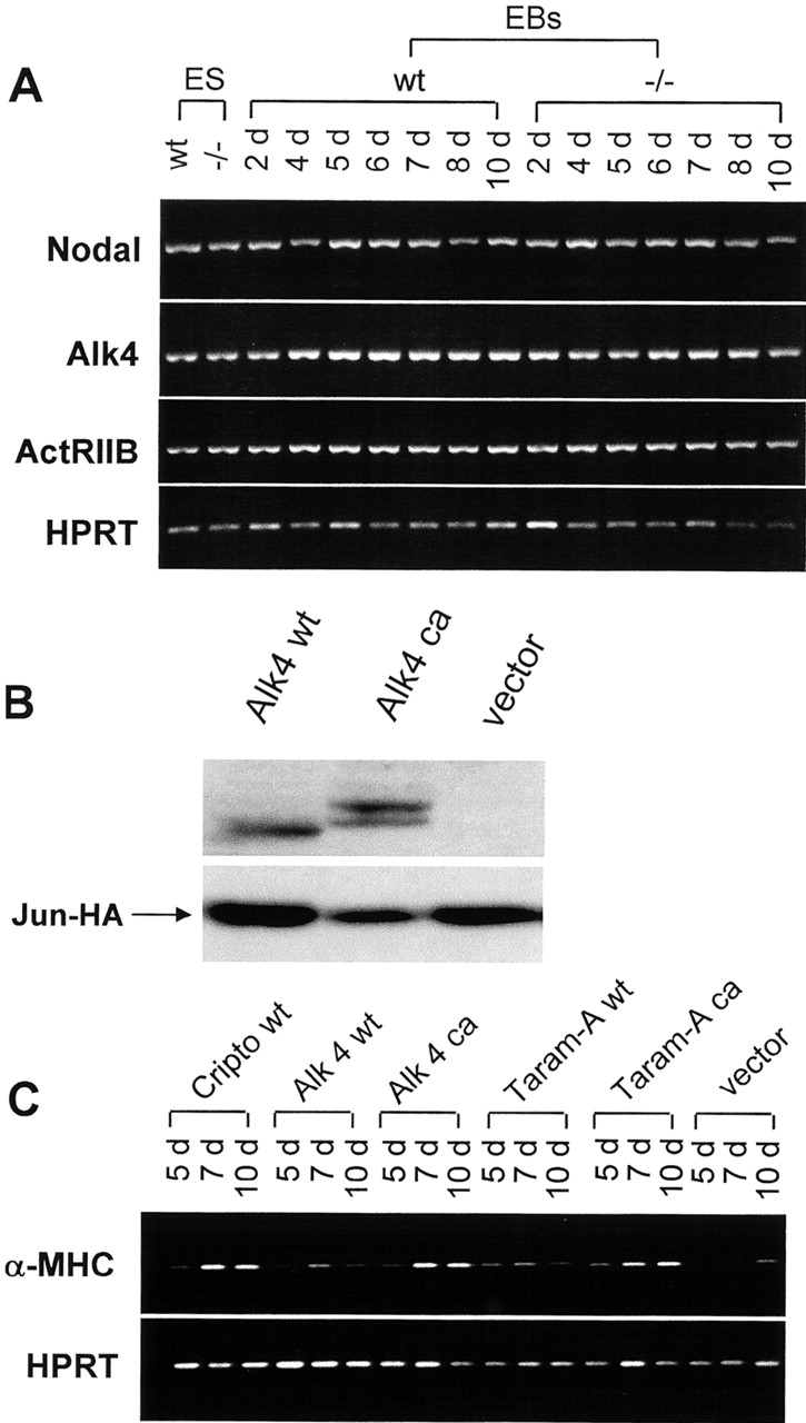 Figure 7. Expression profile of Nodal, Alk4, and ActRIIB during cardiomyocyte differentiation and their effects on cardiac induction. (A) RNA expression levels of Nodal, Alk4, and ActRIIB genes during in vitro differentiation of ES cells. RT-PCR analysis was performed on RNA extracted from either undifferentiated ES or EBs (either wt or Cripto−/−) throughout a differentiation period of 10 d (days 2–10). HPRT gene was used as an internal control. (B) Western blot analysis of total lysates from 293EBNA cells transfected with either wt or ca form of HA-tagged human Alk4. Cells were cotransfected with Jun-HA expression vector as an internal control. A monoclonal anti-HA antibody was used to detect protein levels. (C) RNA expression profile of the αMHC gene during differentiation of Cripto−/− ES cells (days 5, 7, and 10) overexpressing wt and activated forms of either Alk4 or Taram-A. HPRT gene was used as an internal control.