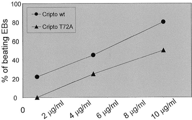 Figure 9. Modulation of Cripto activity by O-fucosylation. Dose-dependent activity of T72A mutant Cripto compared with wt Cripto as assayed in cardiomyocyte differentiation assay. 2-d-old Cripto−/− EBs were treated with increasing amounts of either recombinant soluble T72A mutant or wt Cripto protein for 24 h and then cultured for the remaining days. Appearance of beating areas was scored from day 8 to 12 of the in vitro differentiation. Data are representative of two independent experiments.
