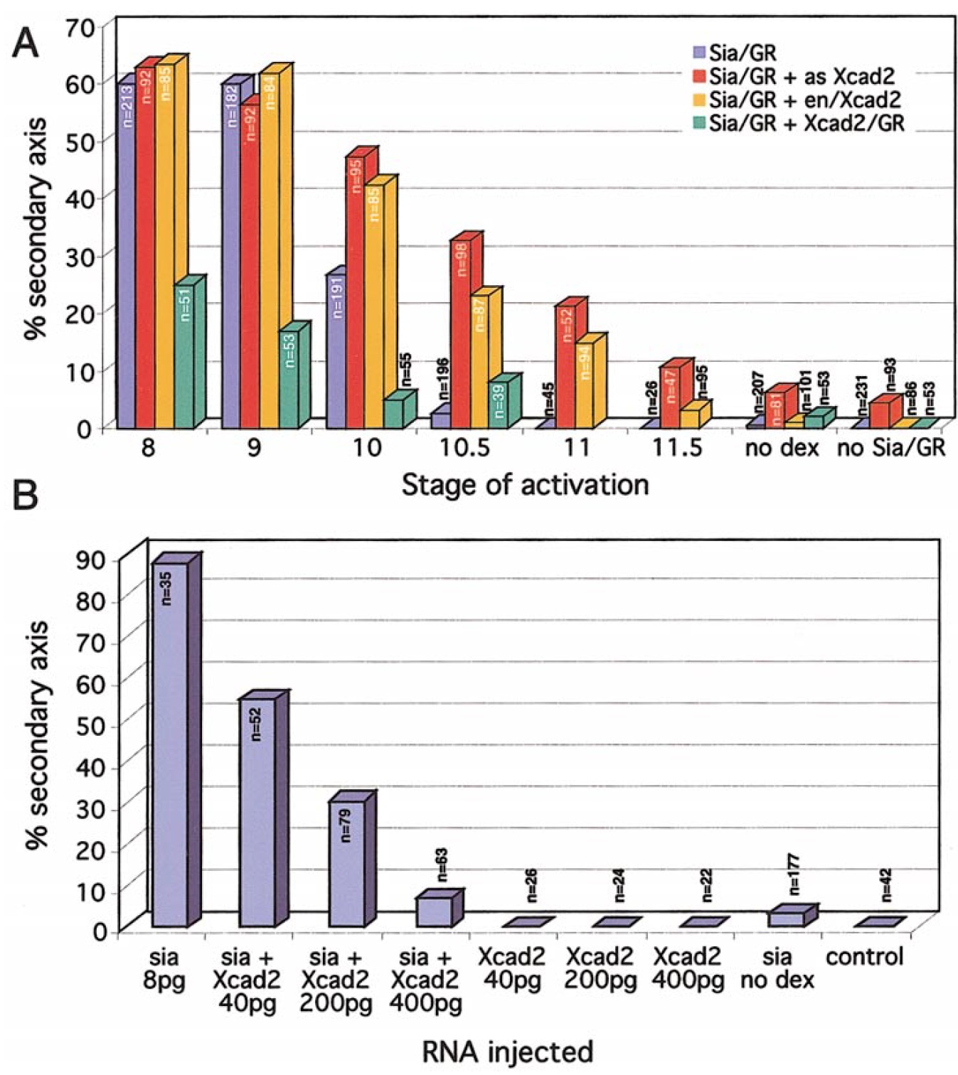 amount of sia/GR RNA (8 pg) alone or with increasing amounts of Xcad2/GR mRNA (40, 200, and 400 pg). The fraction of secondary axes