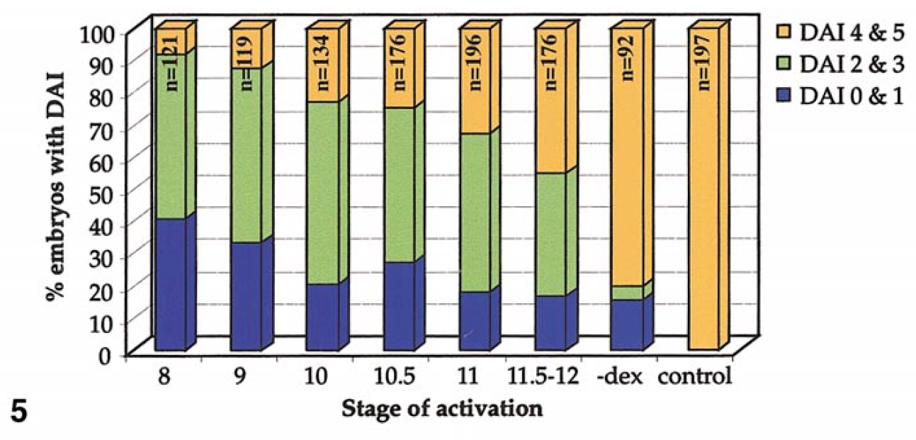 axial defects (DAI 4–5), moderate anterior effects (DAI 2–3), and strong inhibition of organizer activity (DAI 0–1). The graph represents the