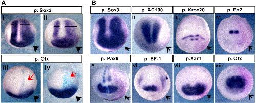 Fig. 4. δXTcf3-mediated expansion of the neural plate can be uncoupled from effects on A patterning. (A) Embryos injected into one cell at the eight-cell stage with mRNA encoding δXTcf3 show expanded expression of Sox3 along the entire A axis (i, ii). However, sibling embryos show little or no expansion of Otx expression (iii, iv); note the lineage tracer, β-gal (light blue stain) along the entire A axis and highlighted by red arrow. (B) At doses of δXTcf3 RNA that expand Sox3 (i), the mesoderm marker Muscle Actin (ii) appears relatively unaffected on the injected side (arrow). A neural markers show normal expression on the injected side (arrow) relative to contralateral control. Markers examined are (iii) Krox20; (iv) En-2; (v) Pax6; (vi) BF-1: (vii) Xanf (viii) Otx with "p." denoting probe used.