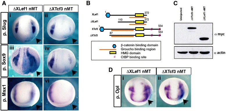 δXLef1 and δXTcf3 differ in their ability to influence neural crest induction. (A) Embryos injected with mRNA encoding β-gal and δXLef1 nMT (i, iii, v) or δXTcf3 nMT (ii, iv, vi) were examined by in situ hybridization for expression of Slug (i, ii); Sox9 (iii, iv); and Msx1 (v, vi), with .denoting probe used. All embryos are positioned showing anterior/dorsal side, with their injected side to the right (arrow). δXTcf3 potently blocks expression of neural crest markers while δXLef1 does not. (B) Schematic representation of constructs utilized in these experiments compared to full-length coding regions. (C) Western blot demonstrating that δXLef1 and δXTcf3 were expressed at equivalent levels in these experiments; blot was stripped and re-probed for actin as a loading control. (D) Expression of either δXLef1 nMT or δXTcf3 nMT leads to an increase in Opl/Zic1 expression. Light blue staining is lineage tracer β-gal.