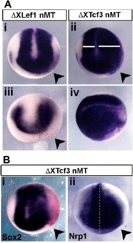 Fig. 7. Activation of Wnt/β-catenin signals inhibits neuronal precursor formation. (A) Schematic showing the XLef1 and XTcf3 constructs utilized in these experiments. (B) Upregulation of canonical Wnt signals via expression of δβ-catenin (i, iv, vii) or constitutively activating forms of XLef1 or XTcf3 (β-cateninδXLef1, ii, v, viii; β-cateninδXTcf3, iii, vi, ix) expands expression of the neural crest marker Slug (iii) and inhibits expression of the pan-neural markers Sox3 (ivi) and Nrp1 (viiix). The red arrow in panels v, vi, and ix point to cleared patches of staining where the Wnt pathway is ectopically activated. (C) The inhibition of Sox3 by β-cateninδXTcf3 (ii, v) can be rescued by coexpression of δXTcf3 (iii, vi).