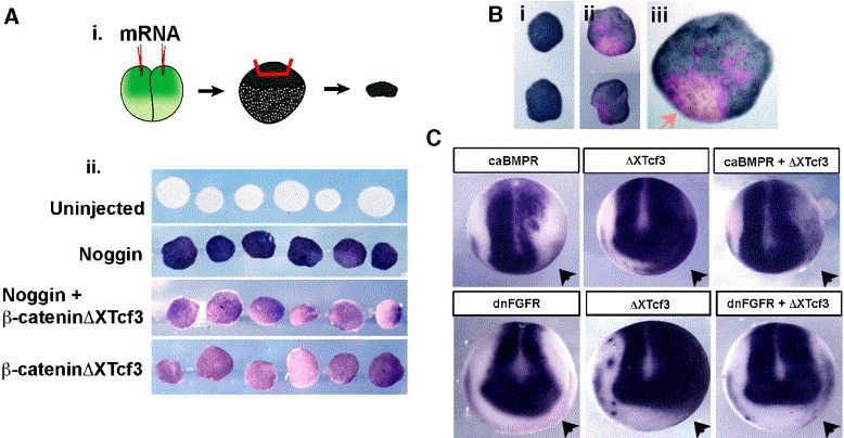 Fig. 8. Neural induction requires the interplay of BMP, FGF and Wnt signals. (A) (i) Schematic of an animal cap assay. (ii) In situ hybridization examining Sox3 expression in animal caps injected as indicated and cultured to Stage 15. Sox3 expression is induced by BMP attenuation (Noggin expressing caps) but not by β-cateninδXTcf3. β-CateninδXTcf3 inhibits Noggin-mediated Sox3 expression when coexpressed. (B) β-CateninδXTcf3 inhibits Sox3 expression cell autonomously. Embryos were injected with mRNA encoding Noggin in both cells at the two-cell stage (iii) and subsequently at the four-cell stage a single blastomere was injected with β-gal alone (i) or β-gal plus β-cateninδXTcf3 (ii, iii). Note that cells expressing lineage tracer and β-cateninδXTcf3 do not also express Sox3. (iii) Magnified view of upper explant pictured in ii. (C) Embryos were injected into one cell at the two-cell stage with the indicated mRNA (noted in boxes above the embryo) and β-gal RNA. Embryos were harvested at stage 15 and probed for Sox3. Blocking FGF signals with a dominant inhibitory FGF receptor (dnFGFR) partially rescues expansion of the neural plate seen with δXTcf3 alone. Upregulation of BMP signaling with a constitutively active type 1 BMP receptor (caBMPR) also rescues the δXTcf3-mediated expansion of the neural plate and also decreases expression of Sox3 within the normal neural plate forming region. These findings indicate that the ability of δXTcf3 to induce ectopic neural tissue is dependent on the status of BMP and FGF signals. Arrows indicate injected side.