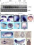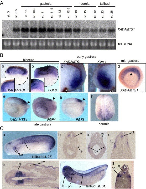 Fig. 2. Analysis of XADAMTS1 expression. (A) Northern blot analysis. Total RNA (10 μg) from different developmental stages was loaded in each lane. Bands of 18S rRNA stained with ethidium bromide were used for a loading control. (B) Whole-mount in situ hybridization for XADAMTS1 mRNA during blastula to neurula stages. (a, b) Late blastulae (stage 8.5) bisected vertically after staining for XADAMTS1 (a) and FGF8 (b). Magnified images of the enclosed regions are shown in the inset. (c) Comparison of expression domains between XADAMTS1 and Xlim-1 at the gastrula stage (stage 10.5). Embryos were bisected into left and right halves and subjected to whole-mount in situ hybridization for XADAMTS1 (left panel) and Xlim-1 (right panel), respectively. Dorsal is to the right (XADAMTS1) or the left (Xlim-1). (d) Vegetal view of a mid-gastrulaembryo (stage 11.5) cleared with BB/BA. (eâg) Late gastrulae (stage 12) bisected sagittally after staining for XADAMTS1 (e), FGF4 (f), and FGF8 (g). Dorsal is upwards; anterior is to the left. (h) Dorsal view of neurula (stage 18). Anterior is upwards. (C) Expression patterns of XADAMTS1 at tailbud stages. (a) Early tailbud stage embryo (stage 26). Transverse (bâd) and horizontal (e) sections of stained tailbud stage embryos (stage 26). (f) Late tailbud stage embryo (stage 31) cleared with BB/BA. (g) Transverse section of a stained late tailbud stage embryo (stage 31). Dorsal is upwards (aâd, f, g). Anterior is to the left (a, e, f). ba, branchial arch; d, dermatome; e, eye; h, heart anlage; n, notochord; nt, neural tube; ov, otic vesicle; pn, pronephros. Arrowheads indicate the dorsal blastopore.