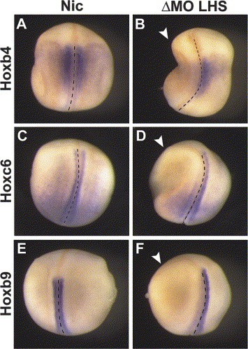 Fig. 2. Hox gene expression during somitogenesis is affected by the downregulation of X-Delta-2. Non-injected controls (Nic; A,C,E) and embryos injected in the left-hand side (LHS) with X-Delta-2 morpholino (MO) (B,D,F) were analysed for Hoxb4 (A,B), Hoxc6 (C,D), and Hoxb9 (E,F) expression at tailbud stage (stage 21). Embryos are shown from the dorsal side with anterior to the top. All three Hox genes were downregulated but whilst Hoxb4 (B: 97%, n=31) and Hoxb9 (F: 100%, n=22) expression was severely downregulated along the AP axis, the posterior expression of Hoxc6 (D: 91%, n=23) was not affected. The arrowhead indicates the injected side of the embryo. Dotted line indicates the midline. |
