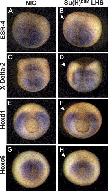 Fig. 7. Expression of a dominant negative Su(H) does not affect Hox expression. Non-injected controls (Nic; A,C,E,G) and embryos injected in the left-hand side with dominant negative Su(H) [Su(H)DBM; B,D,F,H] were analysed at neurula stage for the expression of ESR4 (A,B: 85%, n=35) and X-Delta-2 (C,D: 86%, n=37), and at gastrula stage for the expression of Hoxd1 (E,F: 100%, n=21) and Hoxc6 (G,H: 100%, n=23) by whole-mount in situ hybridisation. Embryos at neurula stage are shown from the dorsal side, anterior up, and gastrula embryos from the vegetal side, dorsal up. Su(H)DBM works as a dominant negative affecting the downstream genes of the Notch pathway, ESR4 (B) and inhibiting the X-Delta-2 downregulation in the somitomere region (D) but does not show any effect on Hox expression (F,H). The arrowhead indicates the injected side of the embryo. |
