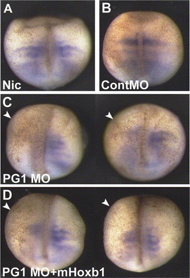 Fig. 10. mHoxb1 rescues X-Delta-2 expression in PG1 knockdown embryos. Non-injected control (A) and embryos injected in the LHS with control MO (B: 100%, n=22), PG1 MOs (C: 81%, n=32) or a combination of PG1 MOs and mHoxb1 (D: 91% rescued, n=23), were analysed for the expression of X-Delta-2 at neurula stage. Embryos are shown from the dorsal side, with the anterior side to the top. X-Delta-2 expression in the somitomeric region is rescued by co-injecting mHoxb1. The arrowhead indicates the injected side of the embryo. |