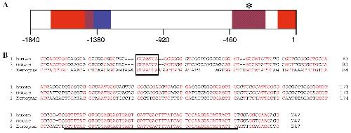 numbered from the predicted start of transcription. The 247 bp conserved region is marked (*). (B) Detail of proximal 247 bp region of high similarity