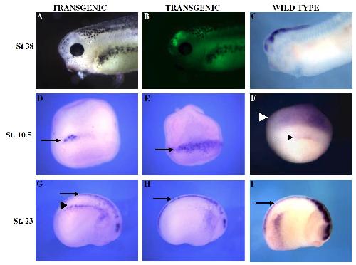embryos exhibited expression of the transgene in regions flanking the neural tube (G, arrowhead).