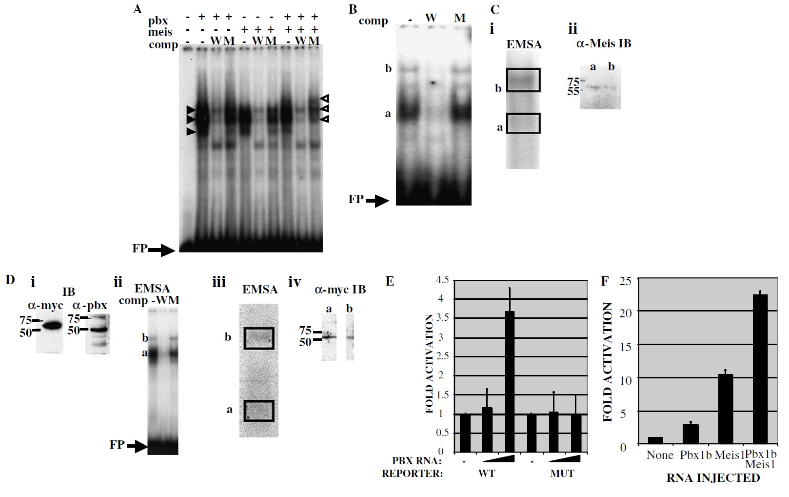 myc-Pbx1b. (iii) Autoradiograph of wet gel from EMSA using lysates of embryos injected with RNA encoding myc-Pbx1b RNA. (iv) Immunoblot of