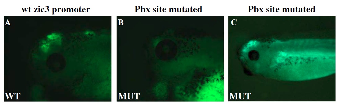 Fig. 4. The conserved Pbx1b binding site is essential for Zic3 promoter function. Transgenic embryos were prepared using wild-type (A) or Pbx mutated