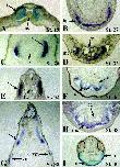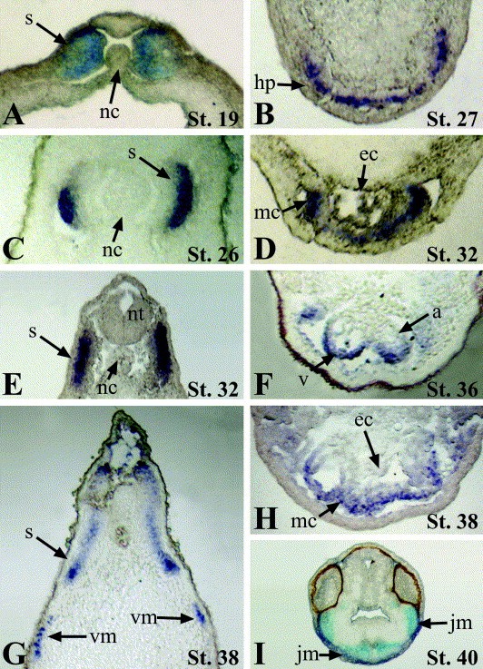 Fig. 3. Histology of Xtn3 expression. Paraffin embedded embryos were sectioned at a depth of 16 μm after in situ hybridization. (A, C, E, and G) Transverse sections through developing somites. (B, D, F, and H) Transverse sections through developing cardiac region. (I) Transverse section showing jaw myoblasts in the head. a, atrium; ec, endocardium; hp, heartprimordia; jm, jaw myoblasts; mc, myocardium; nc, notochord; nt, neural tube; s, somites; v, ventricle; vm, ventral myoblasts.