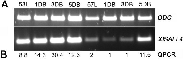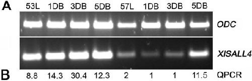 Quantitative reverse transcriptase-polymerase chain reaction (RT-PCR), analysis of XlSALL4 expression in developing hindlimbs and blastemas. A: Semiquantitive RT-PCR, showing levels of XlSALL4 product relative to ornithine decarboxylase (ODC) internal control. B: Relative quantitative real-time polymerase chain reaction (QPCR) data normalized to expression in stage 57 three-day pseudoblastema (3DB) corrected for ODC levels (see Experimental Procedures for more details). 53L, stage 53 hindlimb; 57L, stage 57 hindlimb; 1â5DB on the left are 1-, 3-, and 5-day-old stage 53 blastemas; 1â5DB on right are stage 57 1-, 3-, and 5-day-old pseudoblastemas. |