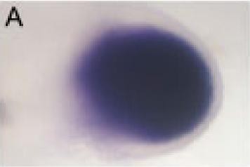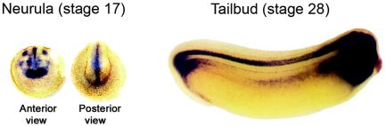 Figure 3. XlSALL4 expression in a stage 17 neurula (anterior and posterior views of two neurulae) and stage 28 tail bud stage embryos. Antisense XlSALL4 probe showed similar whole-mount in situ hybridization signals as Xsal-3 and chick cxal4 (Onuma et al., 1999; Barembaum and Bonner-Fraser, 2004). At the neurula stage, expression is localized to the developing central nervous system (CNS) and neural crest. At the tail bud stage, expression is prominent in the in the CNS, branchial arches, and tail bud/tail tip. Sense XlSALL4 probe gave no signal (data not shown). |