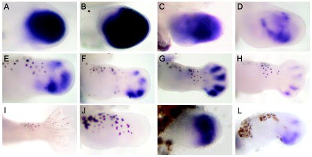 Figure 4. Expression of XlSALL4 during normal Xenopus limb development. AâI,K,L: Whole-mount in situ hybridization with the anti-sense XlSALL4 probe of stage 48 (A), 50 (B), 51 (C), 52 (D), 52+ (E), 53 (F), 54 (G), 55 (H), 57 (I) hindlimbs and stage 51+ (K), stage 53+ (L) forelimbs. J: A stage 53 hindlimb sense XlSALL4 probe control is shown. Dorsal views with the posterior side (pigmented) up and proximal to the left. Melanocytes are colored brown, while positive XlSALL4 signals are blue/purple. Magnifications are variable to fit different size limbs into constant boxes. |