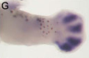 sall4 ( sal-like 4 ) gene expression in Xenopus laevis, developing hindlimb, NF stage 48, as assayed by in situ hybridization, proximal is to the left. |
