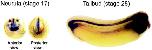 sall4 (sal-like 4) gene expression in Xenopus laevis embryos, NF stage 17, as assayed by in situ hybridization, anterior and posterior views, dorsal up. |