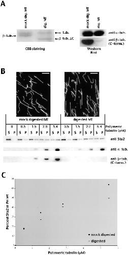 Figure 2. Stu2p does not strongly require the COOH terminus of β-tubulin for binding to microtubules. (A) Mock- or subtilisin- digested microtubules analyzed by SDS-PAGE and Coomassie blue staining (left) or by Western blotting (right) using a monoclonal α-tubulin antibody (top) or a monoclonal β-tubulin antibody whose epitope lies within the COOH terminus of β-tubulin (bottom). (B, top) Mock- and subtilisin-digested microtubules visualized by immunofluorescence. Bar, 5 μm. (B, bottom) Increasing amounts of mock- or subtilisin-digested microtubules were incubated with 18 nM Stu2p and bound separated from unbound Stu2p by centrifugation. Equivalent amounts of the supernatants (S) and the pellets (P) were analyzed by SDS-PAGE and Western blotting using a polyclonal Stu2p antibody (top), a monoclonal α-tubulin antibody (middle), or a monoclonal β-tubulin antibody whose epitope lies within the COOH terminus of β-tubulin (bottom). (C) Plot showing the percentage of Stu2p bound to mock- or subtilisin-digested microtubules at different microtubule concentrations.