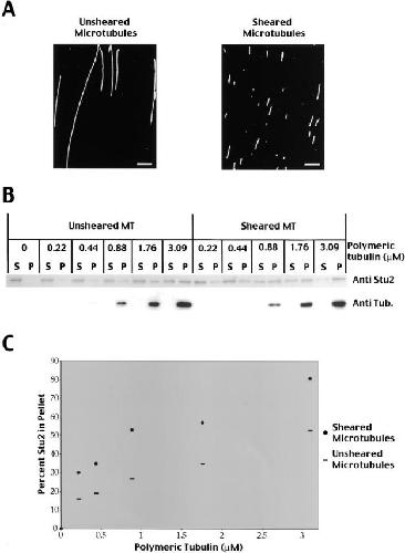 Figure 6. Stu2p binds preferentially to microtubule ends. (A) Antitubulin immunofluorescence of taxol stabilized microtubules before and after shearing with a tip sonicator. Bar, 5 μm. (B) Stu2p binds to a higher extent to sheared microtubules. Increasing amounts of unsheared or sheared microtubules were incubated with 19 nM Stu2p, and bound Stu2p separated from unbound Stu2p by centrifugation. Equivalent amounts of supernatants (S) and pellets (P) were analyzed by SDS-PAGE and Western blotting using a polyclonal Stu2p antibody (top) or a monoclonal tubulin antibody (bottom). (C) Plot showing the percentage of Stu2p bound to microtubules at different microtubule concentrations.