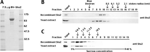 Figure 1. Recombinant, baculovirus-derived Stu2p and endogenous Stu2p show similar hydrodynamic properties. (A) Coomassie blue–stained SDS-polyacrylamide gel showing ∼7.5 μg of purified, baculovirus-derived Stu2p. (B) Determination of the Stokes radius of baculovirus-derived and endogenous Stu2p in yeast extracts using gel filtration on a Superose 6 column. The fractions with recombinant Stu2p (top) or yeast extract (bottom) were separated by SDS-PAGE, and Stu2p was detected by Western blotting using a polyclonal Stu2p antibody. The corresponding positions of selected markers of known Stokes radius are indicated by arrows. (C) Determination of the S value of recombinant and endogenous Stu2p in yeast extracts. Recombinant Stu2p and endogenous Stu2p in yeast extracts were spun through a linear 5–40% sucrose gradient. Fractions were analyzed by SDS-PAGE and Western blotting using a polyclonal Stu2p antibody. (Top) Western blot for recombinant Stu2p; (bottom) Western blot for endogenous Stu2p. Corresponding positions of markers with known S value are indicated by arrows.
