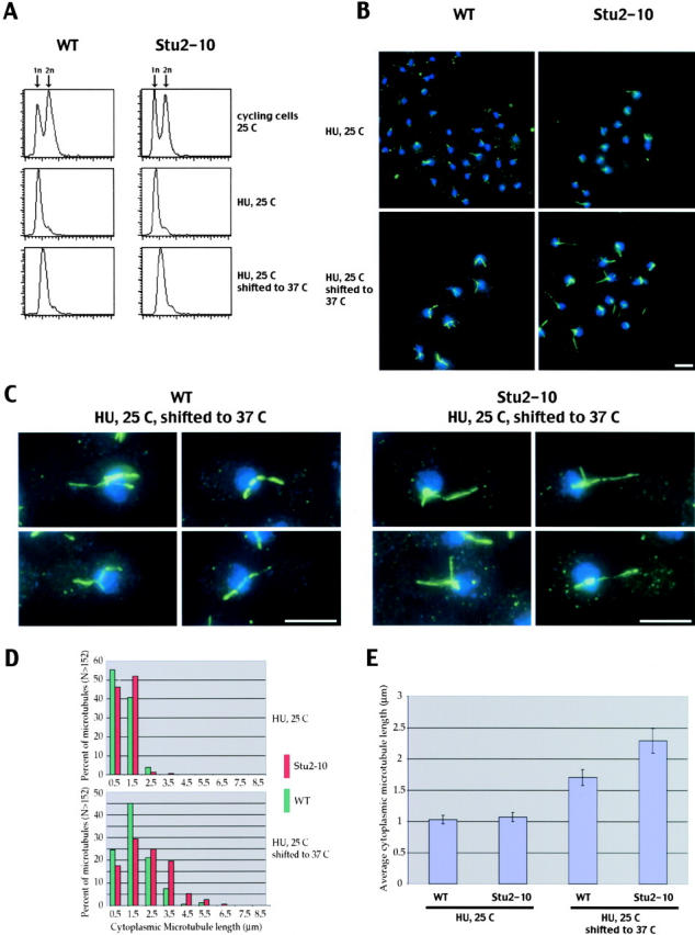 Figure 4. Stu2p can destabilize cytoplasmic microtubules in vivo. Wild-type or stu2–10 cells were HU arrested at the permissive temperature, shifted to the restrictive temperature, and the cytoplasmic microtubule length was determined by indirect immunofluorescence and three dimensional tracking. (A) FACS® profiles of cycling wild-type or stu2–10 cells at 25°C (top) that were arrested at 25°C with HU before (middle) or after shifting the cells to 37°C (bottom). (B) Projected indirect antitubulin immunofluorescence of wild-type or stu2–10 cells arrested at 25°C with HU before (top) or after shifting the cells to 37°C (bottom). Green, microtubules; blue, DNA. Bar, 5 μm. (C) Projected indirect antitubulin immunofluorescence of wild-type (left) or stu2–10 cells (right) arrested at 25°C with HU after shifting the cells to 37°C. Close-ups of four representative cells. Green, microtubules; blue, DNA. Bar, 5 μm. (D) Length distribution (in 1-μm intervals) of cytoplasmic microtubules of wild-type and stu2–10 cells arrested at 25°C with HU before (top) or after shifting the cells to 37°C (bottom). Green, wild-type microtubules; red, stu2–10 microtubules. (E) Average length of cytoplasmic microtubules of wild-type or stu2–10 cells arrested at 25°C with HU before and after shifting the cells to 37°C. Error bars represent SEM (P < 0.05).