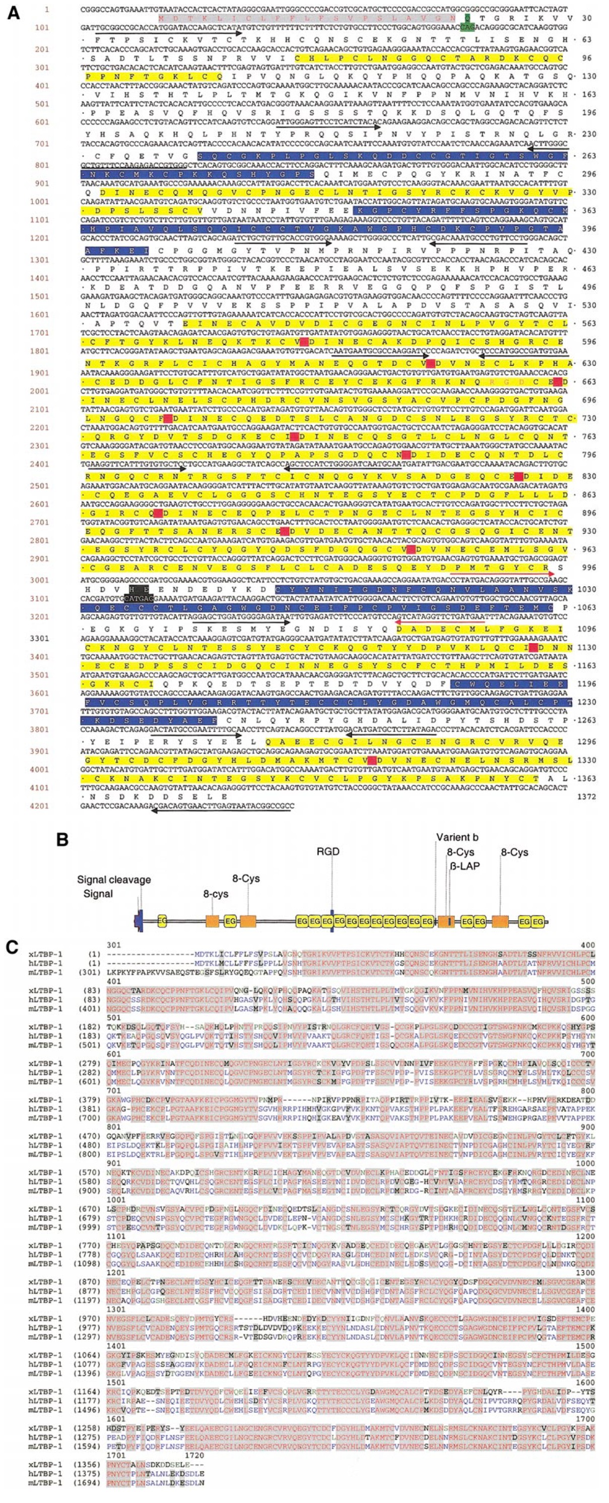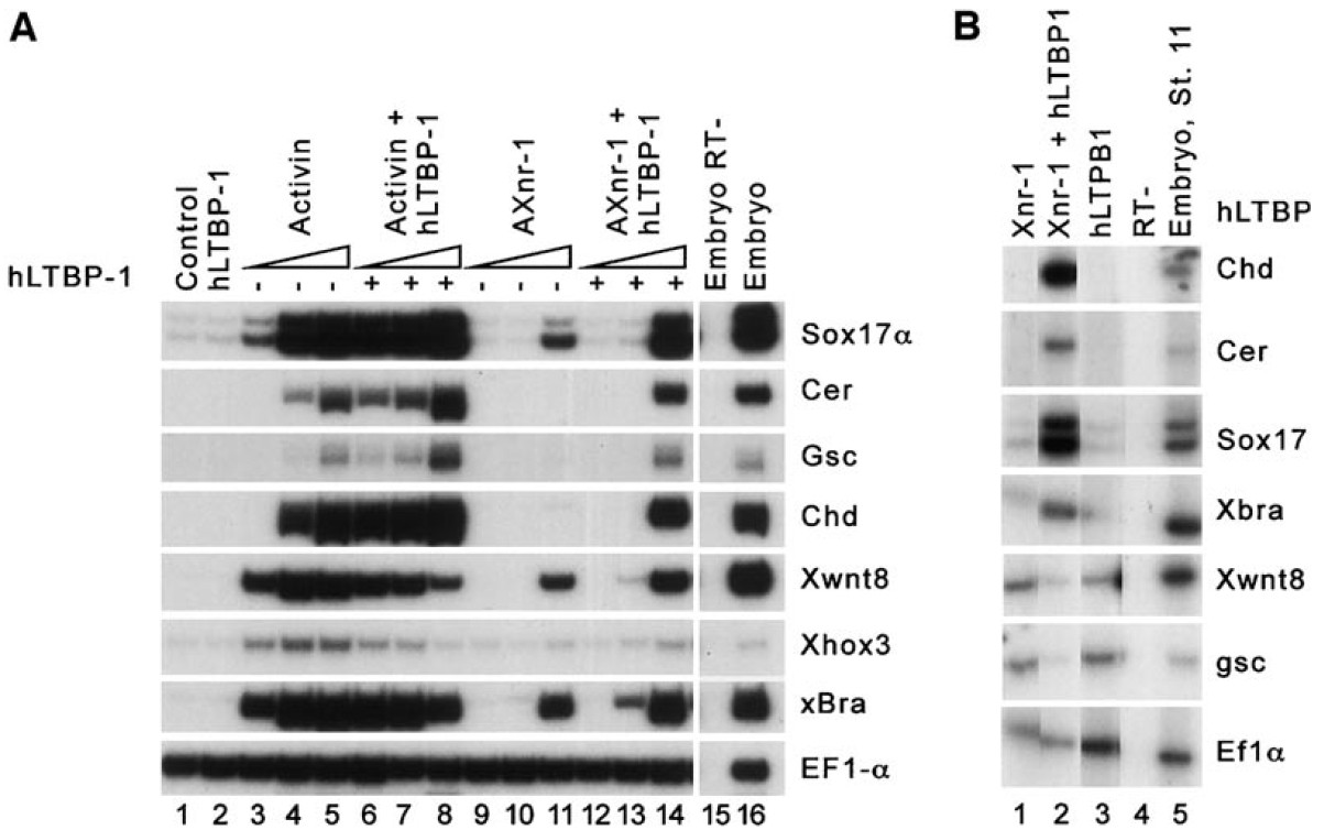 The latent TGF-beta binding proteins (LTBP) are believed to control the availability of TGF-beta in the extracellular milieu. To gain insight into the potential roles of LTBP in early development, we isolated the Xenopus LTBP-1 (xLTBP-1) cDNA. The cDNA encodes a protein similar to the mammalian LTBP-1 in both size and domain structure. In addition, we found a novel longer splice isoform of xLTBP. The RNAs for both forms of xLTBP displayed temporal regulation and the shorter transcript is expressed maternally. Both transcripts also display spatial regulation and are found in the dorsal mesoderm of the organizer. In animal cap experiments, LTBP-1 potentiates the activity of activin and nodal. The activity of LTBP-1 did not appear to require covalent association with activin as the addition of medium containing activin and LTBP-1 to animal caps enhanced the activin effect. These results indicate that LTBP-1 may be part of the regulatory system that establishes the threshold of morphogen activity for activins and nodals in the dorsal side of the embryo during gastrulation.