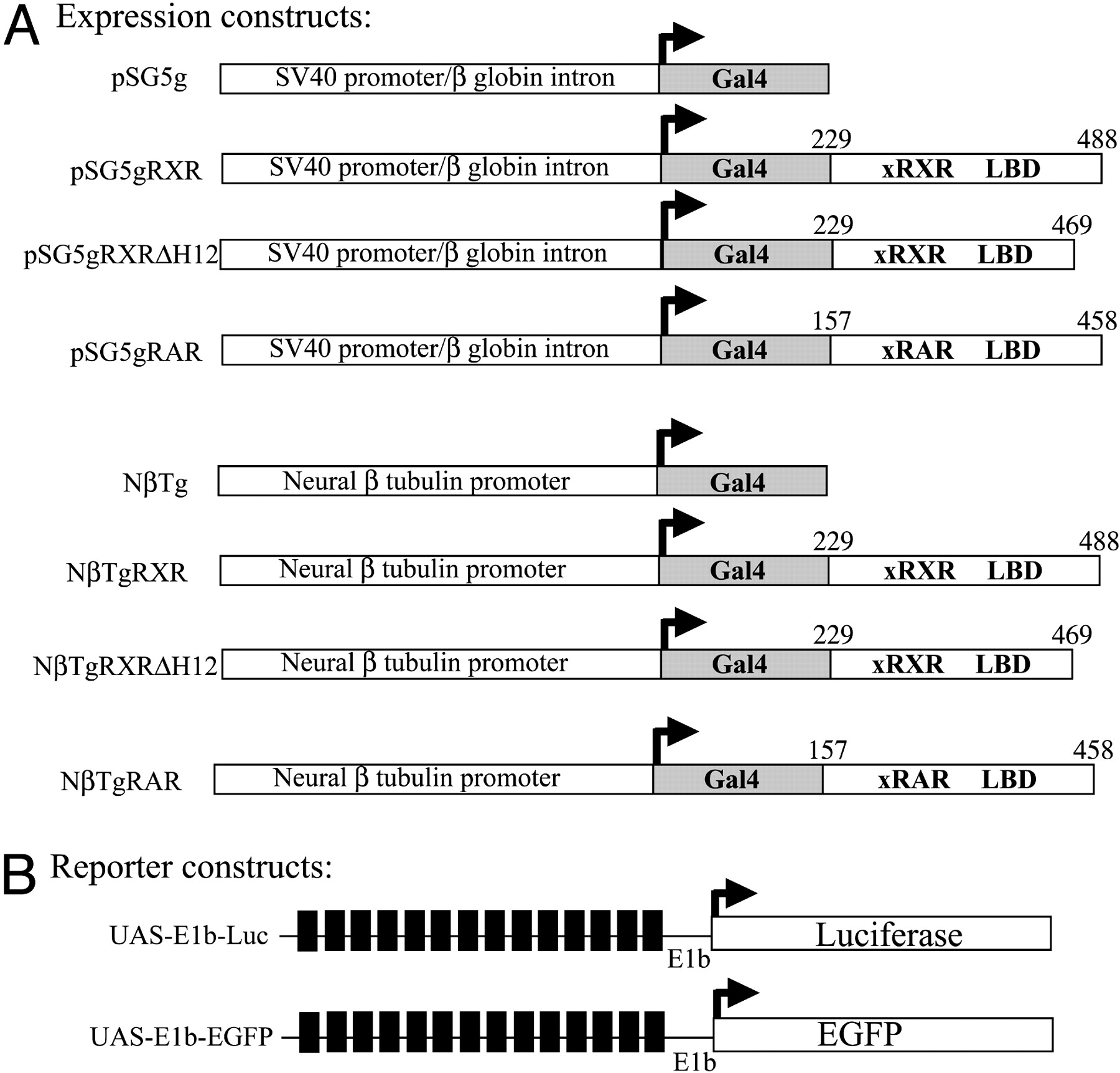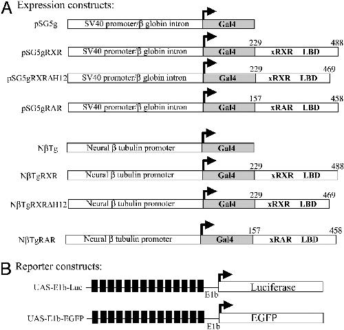 Fig. 1. Schematic diagram of expression and reporter constructs. (A) Gal4 fusion protein expression constructs. The Gal4 DNA-binding domain (amino acids 1â147) was fused in-frame with the ligand-binding domain of X. laevis RXRα (gRXR, amino acids 229â488), RXRα δH12 (gRXRδH12, amino acids 229â469), or RARα (gRAR, amino acids 157â458) under the control of a ubiquitously expressed SV40 early promoter (pSG5) for transfection experiments or the X. laevis neural-β tubulin (NβT) promoter for transgenic experiments. (B) UAS reporter constructs. The EGFP reporter construct UAS-E1b-EGFP contains 14 Gal4 upstream activation sequences (UAS, black boxes) and a minimal promoter (E1b) driving the expression of EGFP. UAS-E1b-Luc is identical to UAS-E1b-EGFP except luciferase is the reporter gene.