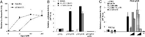 Fig. 2. gRXR fusion proteins regulate UAS reporter genes in transfected XLA cells. Relative luciferase activity was used to quantitate the transcriptional responsiveness of the gRXR or gRAR fusion proteins in response to added ligands. (A) Cells transfected with pSG5gRXR and treated with increasing concentrations of 9-cis RA (squares) or atRA (circles). (B) Cells transfected with pSG5g, pSG5gRXR, pSG5gRAR, or pSG5gRXRδH12 with UAS-E1b-Luc and treated with vehicle alone (DMSO, white bars), 100 nM 9-cis RA (black bars), or RAR selective agonist TTNPB (striped bars) as indicated. (C) Cells transfected with PSG5g or PSG5gRXR and UAS-E1b-Luc and treated with vehicle alone (DMSO), 9-cis RA (100 nM), LG100268 (1, 10, and 100 nM LG268, as indicated), or 9-cis RA with increasing concentrations of LG100208 (0.1, 1, and 10 μM LG208, as indicated). LG268 increased luciferase activity, whereas LG 208 inhibits 9-cis RA effect only at 10 μM. Error bars represent mean ± SEM of triplicates from a representative experiment.