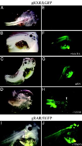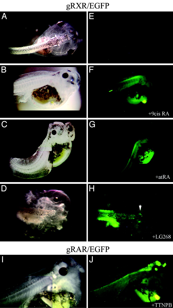 Fig. 5. Exogenous ligand treatment expands GFP expression in gRXR fusion protein expressing embryos. Bright field (A–D and I) and fluorescent images (E–H and J) of transgenic embryos created with NβTgRXR (A–H) or NβTgRAR (I and J) expression vectors and the UAS-E1b-EGFP reporter gene. No expression of reporter gene was observed in untreated swimming tadpoles (A and E). Reporter gene expression was seen in gRXR tadpoles that were treated with exogenous 1 μM 9-cis RA (B and F), atRA (C and G), or LG100268 (D and H). TTNPB induced activation only in gRAR transgene embryos (I and J). Embryos were monitored daily, and activation was observed after 3 days of treatment.