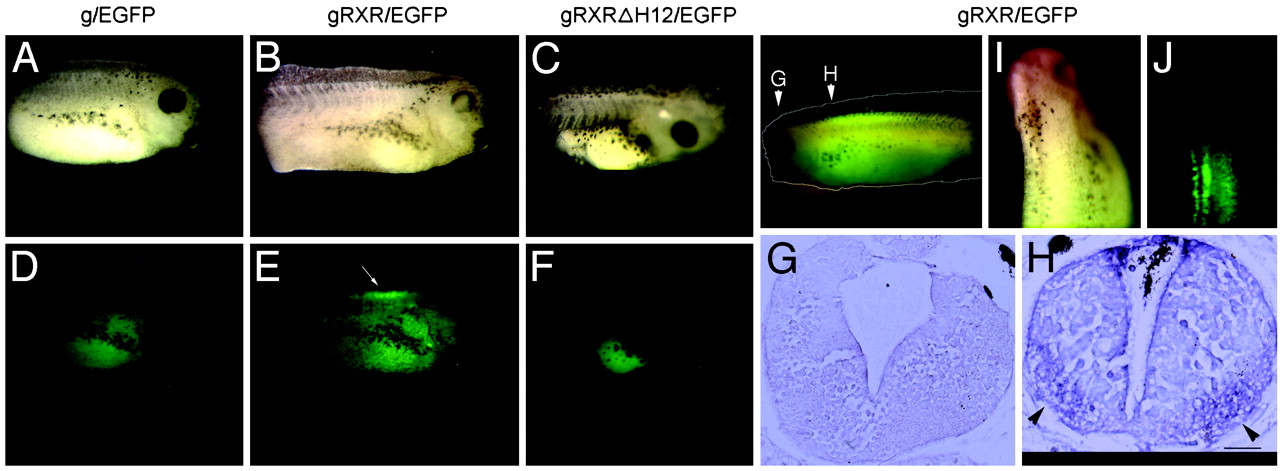 Fig. 3. A gRXR fusion protein expressed in the nervous system activates GFP expression specifically in the rostral spinal cord. Transgenic X. laevis tadpoles were created with UAS-E1b-EGFP along with one of the following expression vectors: NβTg (A and D;g/EGFP), NβTgRXR (B and E; gRXR/EGFP), or NβT gRXRδH12 (C and F; gRXRδH12). Bright field images are shown in AâC; fluorescent images are shown in DâF. Endogenous activation of gRXR was observed only in embryos carrying gRXR/EGFP transgene, and not in g/EGFP alone or mutated gRXRδH12/EGFP. (G and H) Overlaid picture of light and fluorescent images. Cross sections of midbrain (G) and rostral spinal cord (H) of gRXR/EGFP tadpole stained with an anti-EGFP antibody. (I and J) Dorsal view of light (I) and fluorescence (J) images. (Bar, 100 μm.) This pattern was observed in all positive embryos, with few intensity changes along the spinal cord.