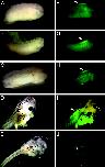 Fig. 4. Developmental activation of the gRXR fusion protein in the X. laevis spinal cord. EGFP expression is specifically induced in the rostral spinal cord of NβTgRXR/UAS-E1b-EGFP transgenic embryos beginning at stage 24 (A and F), and continuing through stages 26 (B and G), 35 (C and H), and 42 (D and I, overlaid image), but disappears by stage 46 (E and J). Bright field images are shown in AâE; fluorescent images are shown in FâJ. Arrows indicate location of fluorescence induced above background autofluorescence, including both spinal cord and eye (in I).
