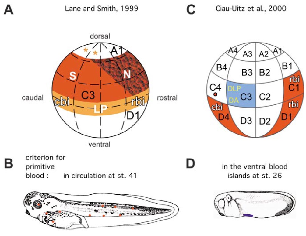 FIG. 1. Conflicting reports on the origins of primitive blood in Xenopus. (A) Lane and Smith (1999) labeled each of the 16 different