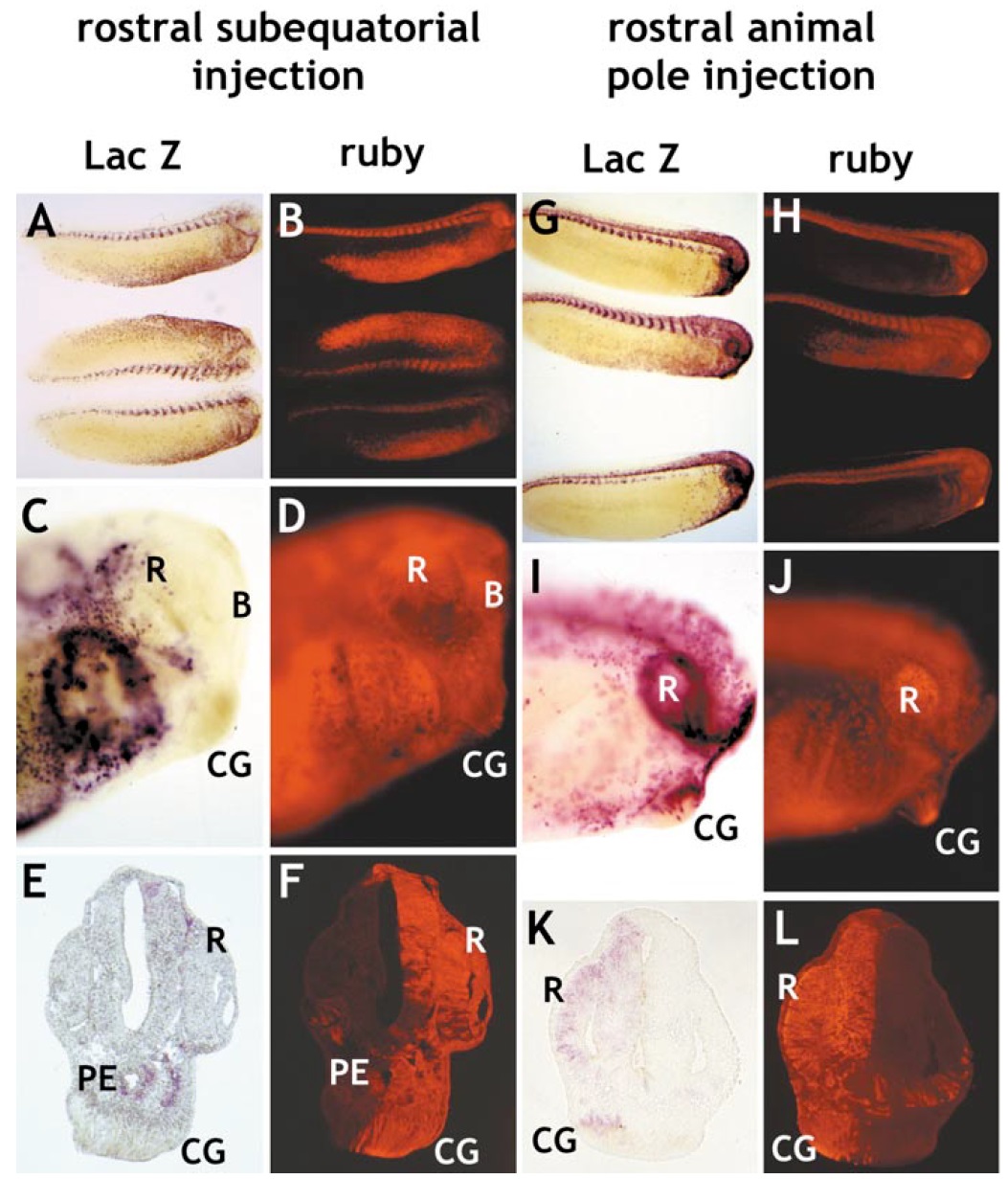animal pole region of a rostral blastomere, at the four-cell stage. The distribution of Lac Z activity (G, I, K) or ruby dextran (H, J, L) in tissues